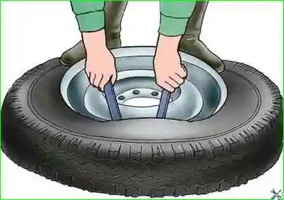 Nachdem Sie sichergestellt haben, dass sich der untere Reifenwulst in der Aussparung der Scheibe befindet, platzieren Sie den äußeren Wulst des Reifens mithilfe von Montagemessern auf der Scheibe (Abb. 3, B).