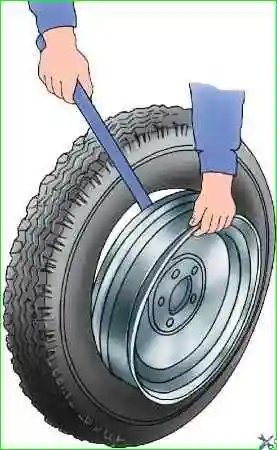 Stellen Sie dazu das Rad unter das Auto, setzen Sie den Wagenheber auf den Reifen in der Nähe der Radscheibe (für den Außenwulst immer auf der dem Ventil gegenüberliegenden Seite), legen Sie ein Brett unter die Basis des Wagenhebers und beginnen Sie Anheben des Autos.