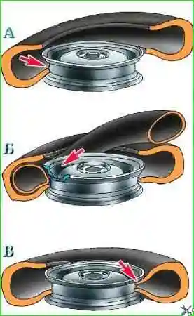 Setzen Sie das Kammerventil in das Loch in der Scheibe ein und setzen Sie die Kammer vorsichtig in den Reifen ein (Abb. 3, B).