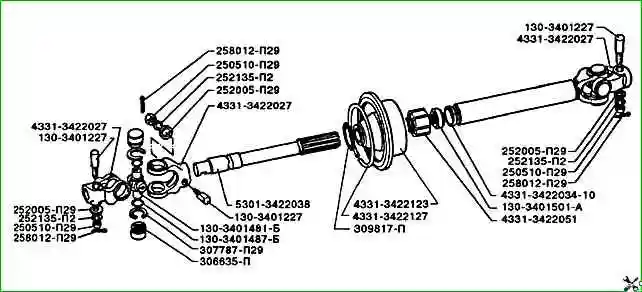 Nummern und Bezeichnungen der Teile der Kardanwelle ZIL-5301 laut Katalog