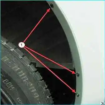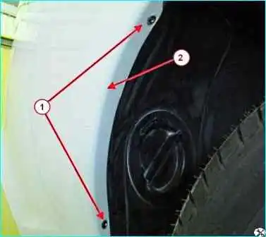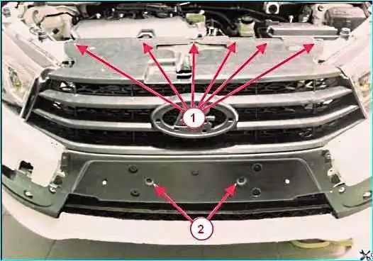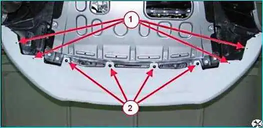 Using TorxT30, T20 heads, unscrew the four screws 2, figure 1 of the lower bumper mount to the body and four self-tapping screws 1 of the lower front wing shield mount to the bumper.