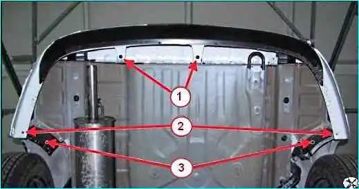 Using a TorxT30,T20 head, unscrew the two bolts 1, Figure 4, of the lower bumper mount to the body and the self-tapping screws 2, of the mudguard apron 3, of the bumper.