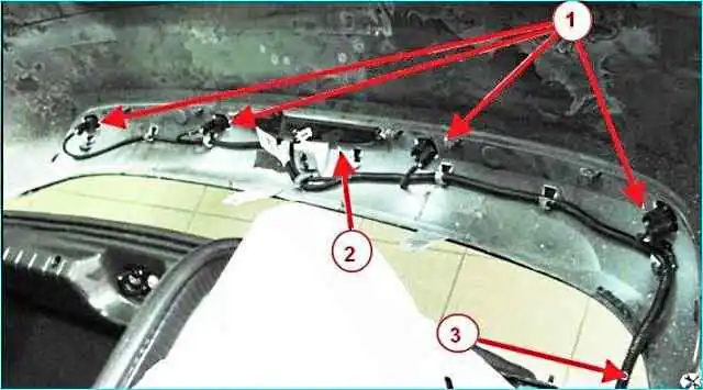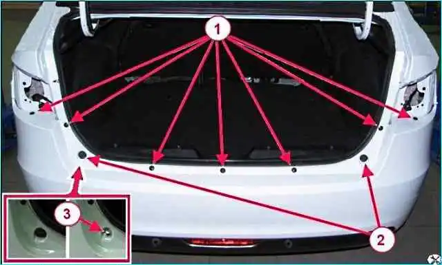 Using a 13 head, unscrew the two bolts 3, having first removed the trunk lid bumper stop 2 installed on the bolt head using a screwdriver.
