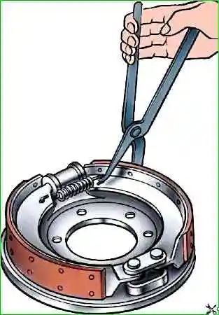 Installing the pads with new linings and assembling the brake mechanisms is in reverse order.