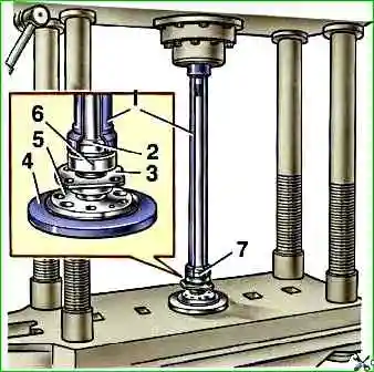 Presione el anillo de bloqueo sobre el semieje usando el mandril 1 en una prensa con una fuerza de no más de 58,8 kN (6000 kgf) de modo que el anillo interior del rodamiento quede sujeto entre el anillo de bloqueo y el hombro del eje. eje.