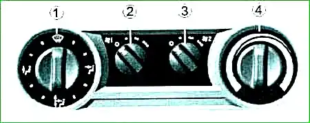 3 — заглушка (для ГАЗ-2705) или ручка регулятора интенсивности прогрева воздуха в кабине ГАЗ-2705 «Комби» или в салоне автобусов 4 — ручка регулятора температуры воздуха в кабине (ручка одновременно управляет краном отопителя и заслонками подмешивания).
