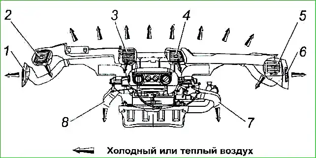 Затем воздух из короба 10 воздухозаборника попадает в кожух отопителя и в зависимости от расположения заслонок подмешивания поступает или через радиатор отопителя или напрямую в распределители потоков воздуха левый 5 и правый 9.