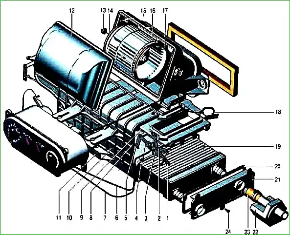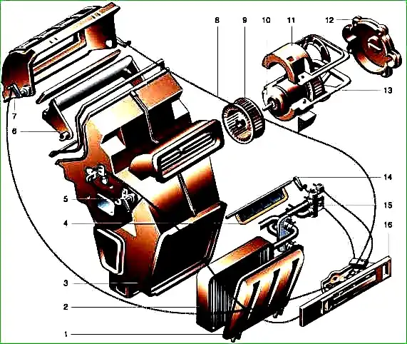 Основной отопитель автомобилей выпуска до 2003 года: 1 - облицовка радиатора; 2 - радиатор отопителя; 3 - кожух отопителя; 4 - нижняя заслонка; 5 - ось центральной воздушной заслонки; 6 - заслонка короба воздухозаборника; 7 - короб воздухозаборника; 8 - тяга привода воздушной заслонки; 9 - вентилятор; 10 - электродвигатель; 11 - верхняя накладка электродвигателя; 12 - крышка электродвигателя; 13 - нижняя накладка электродвигателя; 14 - рычаг нижней заслонки; 15 - краник отопителя; 16 - панель управления отопителем