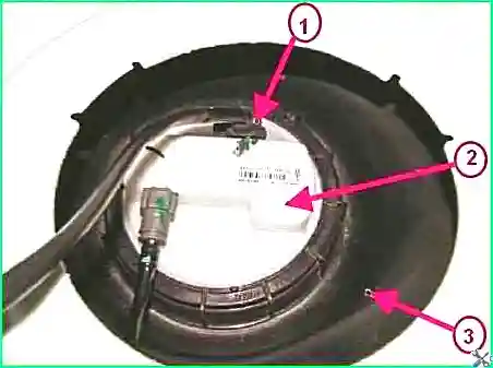 Артқы сымдар блогын электр отын сорғысының модулінен ажырату: 1 - электр отын сорғы модуліне артқы сым сымдарының блогы; 2 - отын сорғысының электрлік модулі; 3 - жанармай багы