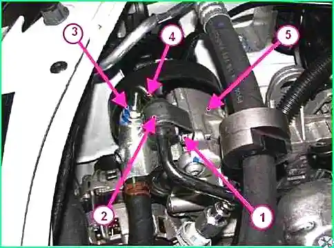 Жоғары қысымды құбырды рульдік рульдік сорғыдан ажырату (K7M қозғалтқышы бар автомобиль үшін): 1 - болт; 2 - бекіту кронштейні; 3 - фитингтік гайка; 4 - руль күшейткішінің жоғары қысымды құбыры; 5 - рульдік рульдік сорғы