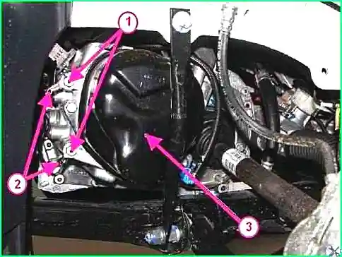 Жерге қосу сымдарын беріліс қорабынан ажырату: 1 - бекіту болты; 2 - жерге қосу сымы; 3 - беріліс қорабы