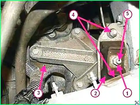 Қозғалтқыштың сол жақ тірегінен беріліс қорабын ажырату: 1 - беріліс қорабын бекіту шпилькасының гайкасы; 2 - қозғалтқышты орнатудың сол жақ жастығы; 3 - беріліс қорабы; 4 - қозғалтқыштың сол жақ бекіткішін бекітетін гайка; 5 - беріліс қорабын бекітетін шпилька