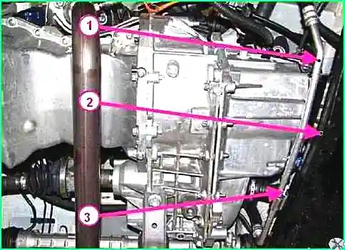 Трансмиссияны басқарудың жетек штангасын ажырату: 1 - беріліс тетігінің қорғаныс қақпағы; 2 - беріліс қорабын басқару штангасын бекітетін болт; 3 - беріліс қорабын басқару жетек штангасы