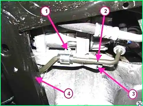 Рульдік күшейткіш құбырды қондырмаларды бекіту кронштейнінен ажырату Тауар (Қ7М қозғалтқышы бар автомобиль үшін): 1 - рульдік басқару құбырын бекітуге арналған болт; 2 - рульдік басқару құбыры; 3 - монтаждалған қондырғыларды орнатуға арналған кронштейн; 4 - алдыңғы аспалы қосалқы жақтау