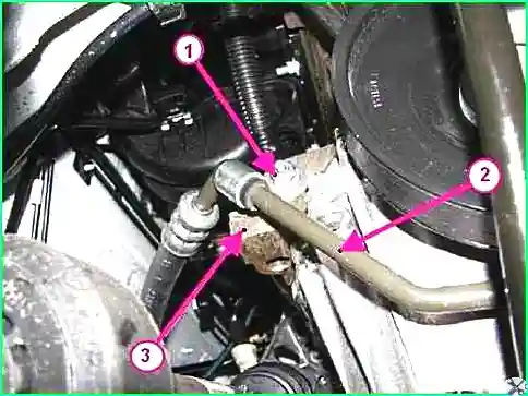 Рульдік басқару құбырын цилиндрлер блогынан ажырату: 1 - рульдің күшейткіш құбырын бекітетін гайка: 2 - рульдің күшейткіш құбыры; 3 - цилиндрлер блогы