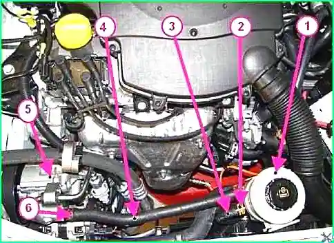 Рульдік рульдік сорғыдан құбырды ажырату: 1 - рульдік рульдік резервуар; 2 - қысқыш; 3 - шланг; 4 - шланг; 5 - рульдік рульдік сорғы; 6 - қысқыш
