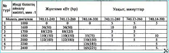 - 3. Цилиндр қақпағын немесе ауыстыру басын алуды қажет ететін басқа бөлшектерді ауыстырғаннан кейін оны цилиндр-поршеньді топ бөліктерін тексеру үшін алып тастағаннан кейін, сондай-ақ майды, сұйықтықты немесе отын сорғыларын, отын сорғысының жетегін, уақыт берілістерін ауыстырғаннан кейін, иінді біліктің тығыздағыштары, маховик корпусы, алдыңғы блоктың қақпақтары, кестеде көрсетілген режимде қозғалтқышта жұмыс істейді. 3.