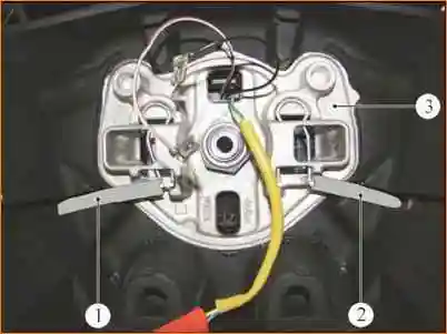 Снятие рулевого колеса: 1 - рулевое колесо; 2 - гайка крепления рулевого колеса; 3 - устройство вращающееся соединителя; 4 - предохранитель транспортировочный