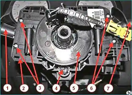 Отсоединяем колодки жгута проводов панели приборов от переключателя 1 указателей поворота и света фар, от переключателя 7 режимов стеклоочистителя и от вращающегося устройства 5.