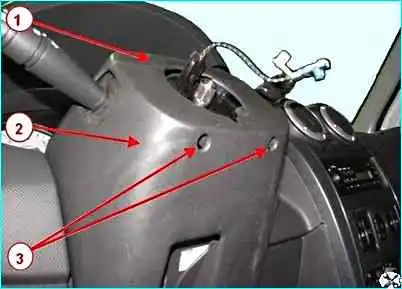 Снятие кожухов рулевой колонки: 1 - верхний кожух рулевой колонки; 2 - нижний кожух рулевой колонки; 3 - винты крепления кожухов рулевой колонки