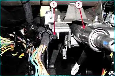 Снятие рулевой колонки: 1 - держатель жгута проводов; 2 - рулевая колонка
