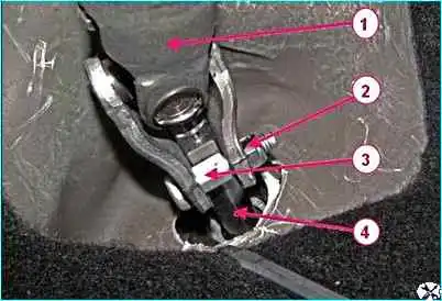 Отсоединение вала руля от вала шестерни рулевого механизма: 1 - шарнир промежуточного вала рулевой колонки; 2 - гайка болта крепления вилки шарнира; 3 - болт крепления вилки шарнира; 4 - вал шестерни рулевого механизма