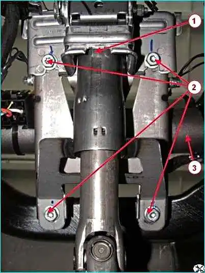 Снятие рулевой колонки: 1 - рулевая колонка; 2 - болты крепления рулевой колонки; 3 - поперечина панели приборов