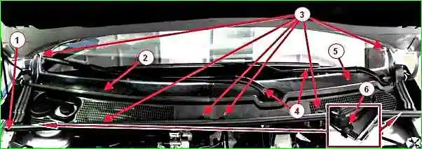 Головкой Torx T20 отворачиваем три самонарезающих винта 3 крепления правой 2 накладки рамы ветрового окна, извлекаем пластмассовую клипсу 6 с помощью приспособления типа 12770 ф. "Stahlwille", снимаем накладку.