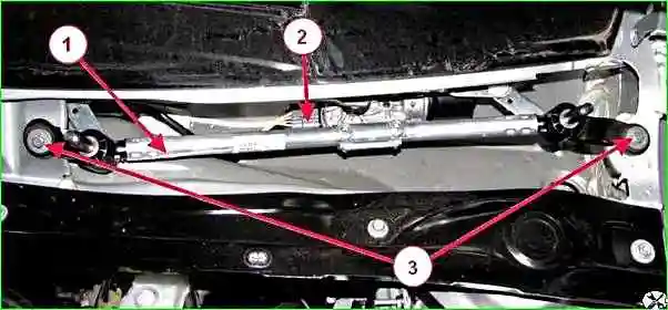 Головкой на 10 отворачиваем два болта 3, рисунок 2, крепления стеклоочистителя 1, снимаем стеклоочиститель, отсоединив от него колодку 2 жгута проводов.