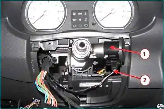 Извлекаем колодку жгута проводов выключателя зажигания из держателя на усилителе поперечины панели приборов, рисунок 2.