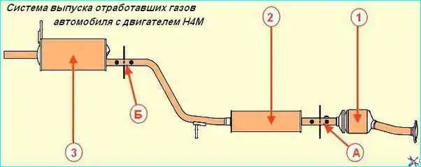 Выхлопные газы двигателя отводятся через выпускной коллектор и систему выпуска газов, включающую в себя каталитический нейтрализатор 1, рисунок 1, глушитель 2 дополнительный и глушитель 3 основной