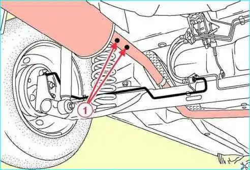 Головкой на 21 откручиваем и извлекаем болты 2 крепления амортизаторов 3 к рычагам задней подвески и аккуратно опускаем рычаги задней подвески, не допуская натяжения тормозных шлангов.