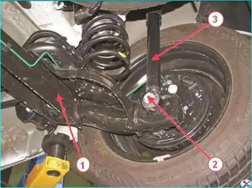 Отсоединение амортизаторов от рычагов задней подвески: 1 – рычаги задней подвески; 2 – болт; 3 – амортизатор задней подвески