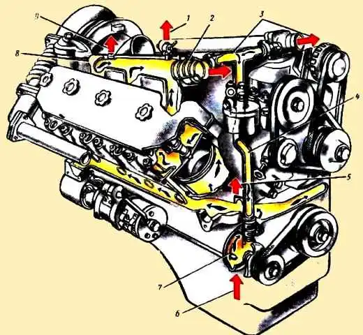 Схема системы охлаждения: 1 - выпуск воздуха при заполнении системы охлаждения во время прогрева пусковым подогревателем: 2 - термостат; 3 - отвод охлаждающей жидкости в радиатор; 4 - трубка перепускная; 5 - подвод жидкости к компрессору пневмотормозов; 6 - подвод охлаждающей жидкости из радиатора; 7 - водяной насос; 8 - отверстие для установки датчика термометра; 9 - отвод горячей воды к отопителю кабины