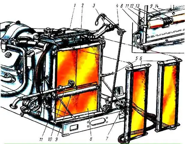 Привод шторки радиатора: 1 - бачок расширительной системы охлаждения двигателя; 2 - радиатор системы охлаждения двигателя; 3 - горловина водоналивная; 4 - трос привода шторки; 5 - щуп масломерный; 6 - радиаторы масляные; 7 - краник для отключения масляных радиаторов; 8 - шторка; 9 - барабан; 10 - горловина маслозаливная; 11 - направляющая кронштейна барабана; 12 - ось; 13 - пружина; 14 - кронштейн барабана