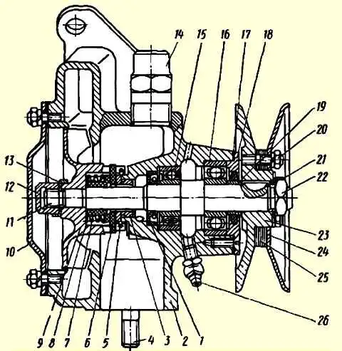 Водяной насос: 1 - сальник; 2 - корпус насоса; 3 - втулка; 4 - шпилька крепления подводящего патрубка; 5 - стопорное кольцо сальника: 6 - упорное кольцо сальника; 7 - пружина сальника; 8 - манжета сальника; 9 - крыльчатка; 10 - крышка; 11 - валик; 12 - гайка; 13 стопорная шайба; 14 - перепускной ниппель трубки водяных термостатов; 15,16- шарикоподшипники; 17 - прокладки; 18 - корпус сальника; 19 - втулка сальника; 20 - гайка крепления боковины шкива; 21 - замковая шайба; 22 - гайка; 23 - ступица шкива; 24 - боковина шкива; 25 - регулировочные прокладки; 26 - пресс-масленка
