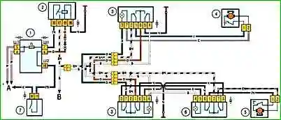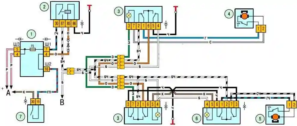 Электропитание к переключателям подается через предохранитель F5 только при включенном зажигании, когда замкнуты контакты реле 2.