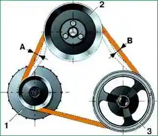 Натяжение характеризуется величиной прогиба ремня между шкивами насоса и коленчатого вала (прогиб "В") (рис. 1) или шкивами генератора и насоса (прогиб А) при приложении усилия 98,1 Н (10 кгс) в середине расстояния между шкивами.
