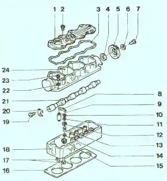 Снять коромысла, упоры и гидравлические компенсаторы зазоров и сложить их так. чтобы при последующей установке они помещались на прежние места и ошибки были исключены.