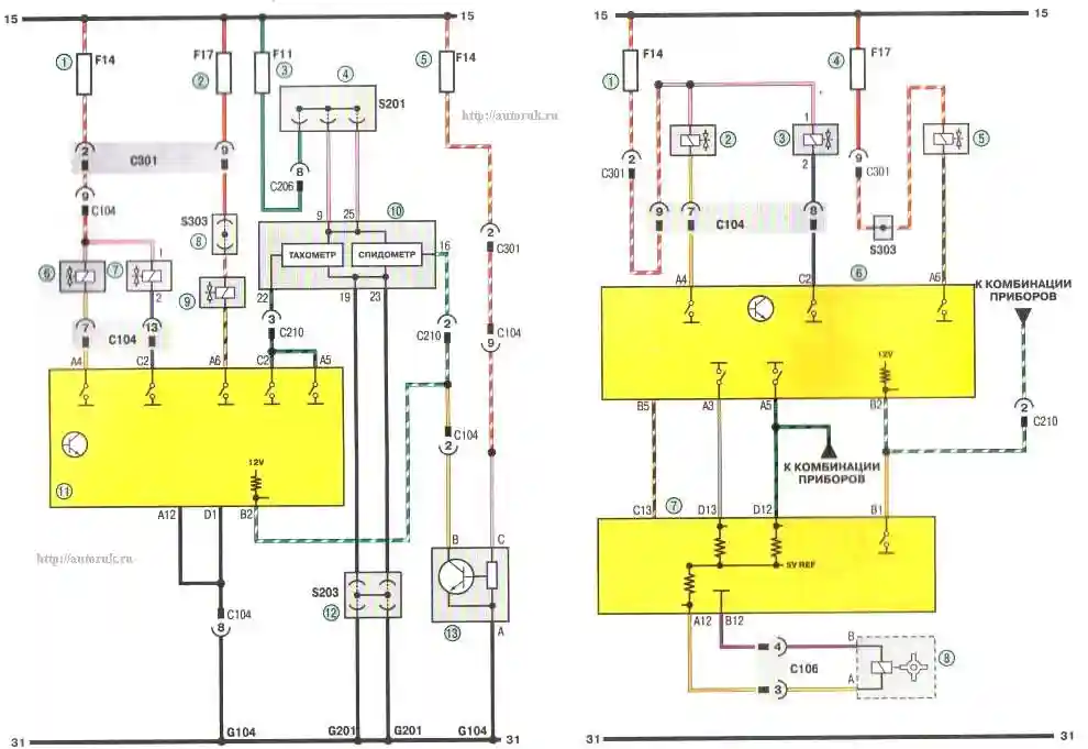 Схема 2г. Система управления двигателем (продолжение): 1,2,5 - предохранители (15 А); 3 - предохранитель (10 А); 4,12 - соединительные колодки; 6 - электромагнитный клапан рециркуляции отработавших газов; 7 - двухходовой клапан; 8 - соединительная колодка; 9 - гравитационный клапан; 10 - комбинация приборов; 11 - электронный блок управления двигателем; 13 - датчик скорости автомобиля (для автомобилей, оснащенных механической коробкой передач)