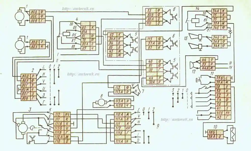 Электрическая схема системы отопления, звуковой сигнализации и стеклоочистки: 1 — электродвигатель отопителя, 2 — переключатель электродвигателей отопителя, 3 — стеклоочиститель, 4 — реле электродвигателей отопителя, 5 — предохранитель 13.3722 (7,5 А), 6 — предохранитель ПР 310 (10 А), 7 — переключатель стеклоомывателя, 8 — стеклоомыватель, 9 — переключатель стеклоочистителя, 10 — электропневмоклапан, 11 — комбинированный переключатель света, 12 — звуковой сигнал (зуммер), 13 — тональные сигналы, 14 — реле звуковых сигналов; I — к выводу AM выключателя приборов и стартера, II — к выводу КЗ выключателя приборов и стартера, III — к реле сигналов торможения, IV — к блоку контрольных ламп
