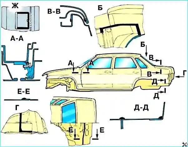 После замены отдельных деталей кузова промажьте сварные швы с обеих сторон пластизолем д-4А и нанесите невысыхающую мастику типа 51-Г-7 в угловые стыки и зазоры, показанные на рисунке.