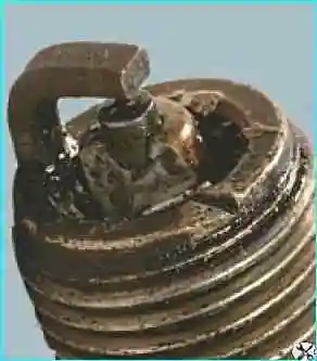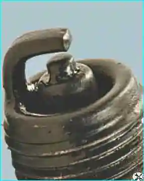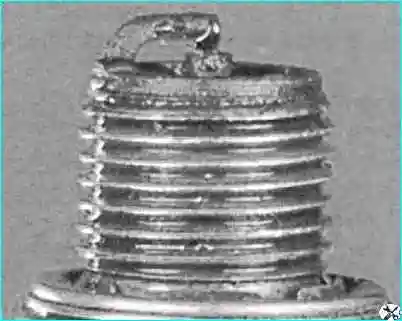 Изолятор белый, но может быть загрязнен из-за пропусков искры и попадающих на него отложений из камеры сгорания.