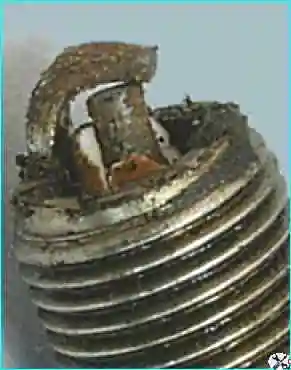 Повреждения могут быть вызваны инородными предметами, попавшими в камеру сгорания, а в случае использования слишком длинной свечи ее электроды может зацепить поршень.