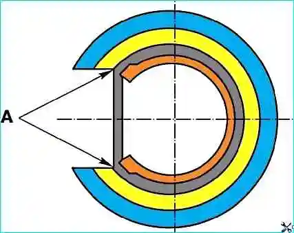Прежде чем вставлять в картер опорную втулку, установите в ее канавки демпфирующие кольца 1 так, чтобы тонкая часть колец находилась напротив разреза втулки.