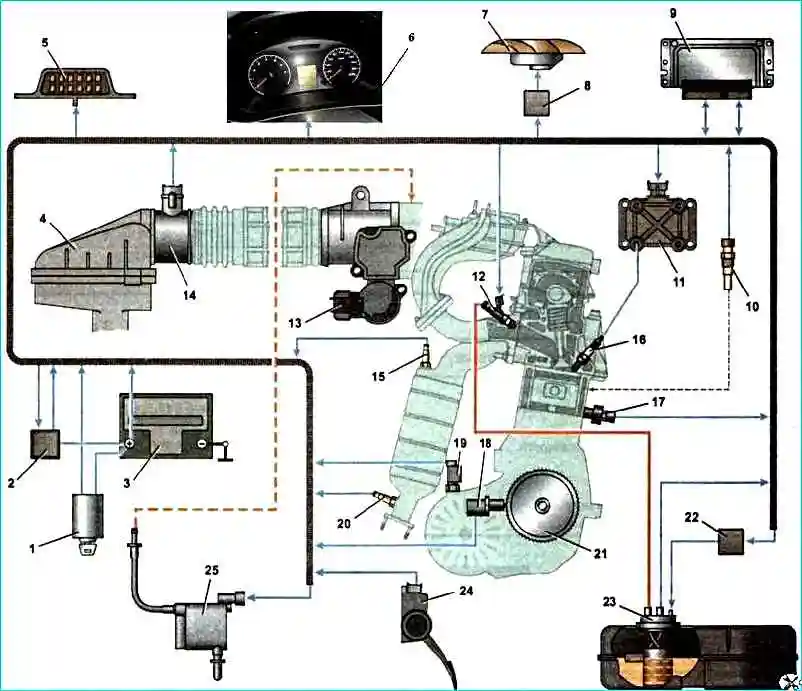 Система управления двигателем: 1 - выключатель зажигания; 2 - главное реле; 3 - аккумуляторная батарея; 4 - воздушный фильтр; 5 - диагностический разъем; 6 - щиток приборов; 7 - электровентилятор системы охлаждения; 8 - реле включения электровентилятора; 9 - электронный блок управления; 10 - датчик температуры охлаждающей жидкости; 11 - катушка зажигания; 12 - топливная форсунка; 13 - дроссельный узел; 14 - датчик массового расхода воздуха; 15 - датчик концентрации кислорода (управляющий); 16 - свеча зажигания; 17 - датчик детонации; 18 - датчик положения коленчатого вала; 19 - датчик скорости автомобиля; 20 - датчик концентрации кислорода (диагностический); 21 - шкив коленчатого вала; 22 - реле включения топливного насоса; 23 - топливный модуль; 24 - электронная педаль газа; 25 - клапан продувки адсорбера
