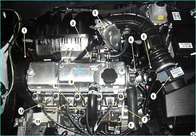 Расположение элементов системы управления двигателем в моторном отсеке: 1 - место установки датчика положения коленчатого вала; 2 - топливная форсунка третьего цилиндра (на фото не видны форсунки других цилиндров); 3 - дроссельный узел; 4 - датчик температуры охлаждающей жидкости; 5 - клапан продувки адсорбера; 6 - датчик массового расхода воздуха; 7 - свеча зажигания четвертого цилиндра; 8 - катушка зажигания и высоковольтные провода; 9 - свеча зажигания третьего цилиндра; 10 - датчик детонации; 11 - свеча зажигания второго цилиндра; 12 - свеча зажигания первого цилиндра