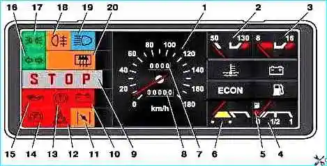 Комбинация приборов: 1 – Спидометр; 2 - Указатель температуры охлаждающей жидкости; 3 - Вольтметр; 4 - Указатель уровня топлива; 5 - Контрольная лампа резервного остатка топлива; 6 - Эконометр; 7 - Счетчик суточного пробега; 8 - Счетчик суммарного пробега; 9 - Контрольная лампа “Stop”; 10 - Контрольная лампа заряда аккумуляторной батареи; 11 - Контрольная лампа прикрытия воздушной заслонки карбюратора; 12 - Контрольная лампа включения аварийной сигнализации; 13 - Контрольная лампа падения уровня тормозной жидкости; 14 - Контрольная лампа включения стояночного тормоза; 15 - Контрольная лампа аварийного давления масла; 16 - Контрольная лампа включения указателей поворота; 17 - Контрольная лампа включения габаритных фонарей; 18 - Контрольная лампа включения задних противотуманных фонарей; 19 - Контрольная лампа включения дальнего света фар; 20 - Контрольная лампа включения обогрева стекла двери задка