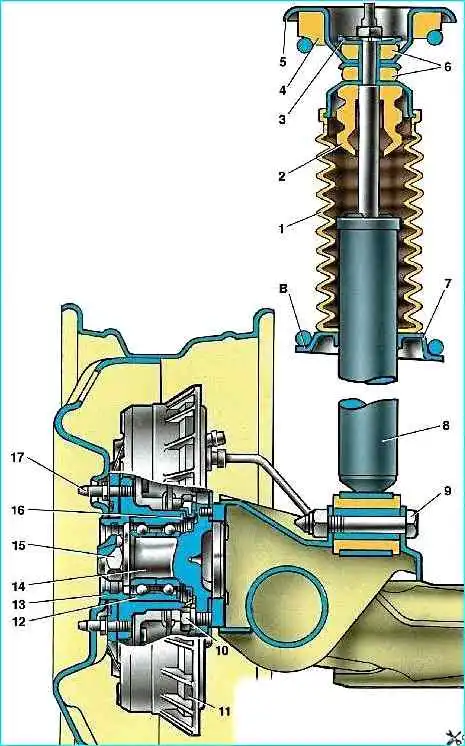 Нижняя проушина амортизатора крепится болтом к кронштейну 15 рычага подвески, а его шток закреплен на верхней опоре пружины подвески через две резиновые подушки 8 (одна – снизу опоры, другая – сверху) и опорную шайбу 7 (под гайкой).