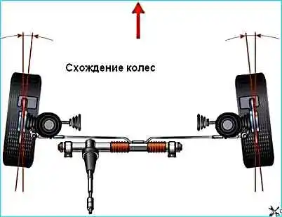 Схождение колес способствует правильному положению управляемых колес при различных скоростях движения и углах поворота автомобиля.